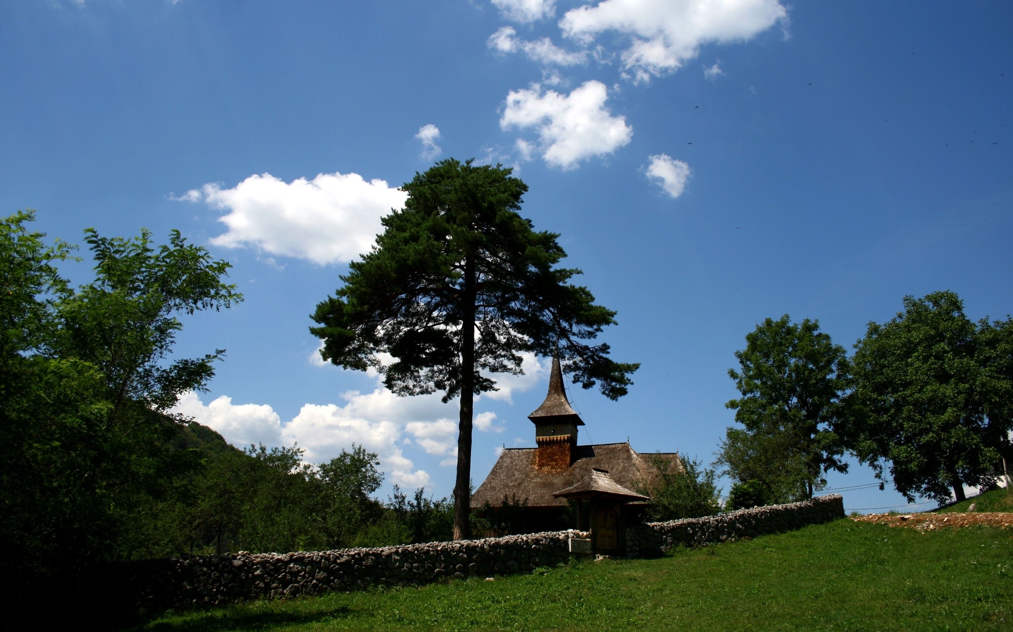 Free image/jpeg, Resolution: 2048x1277, File size: 666Kb, small old church among trees at summer, landscape picture with tags: church, tree, rural, religion, architecture, blue