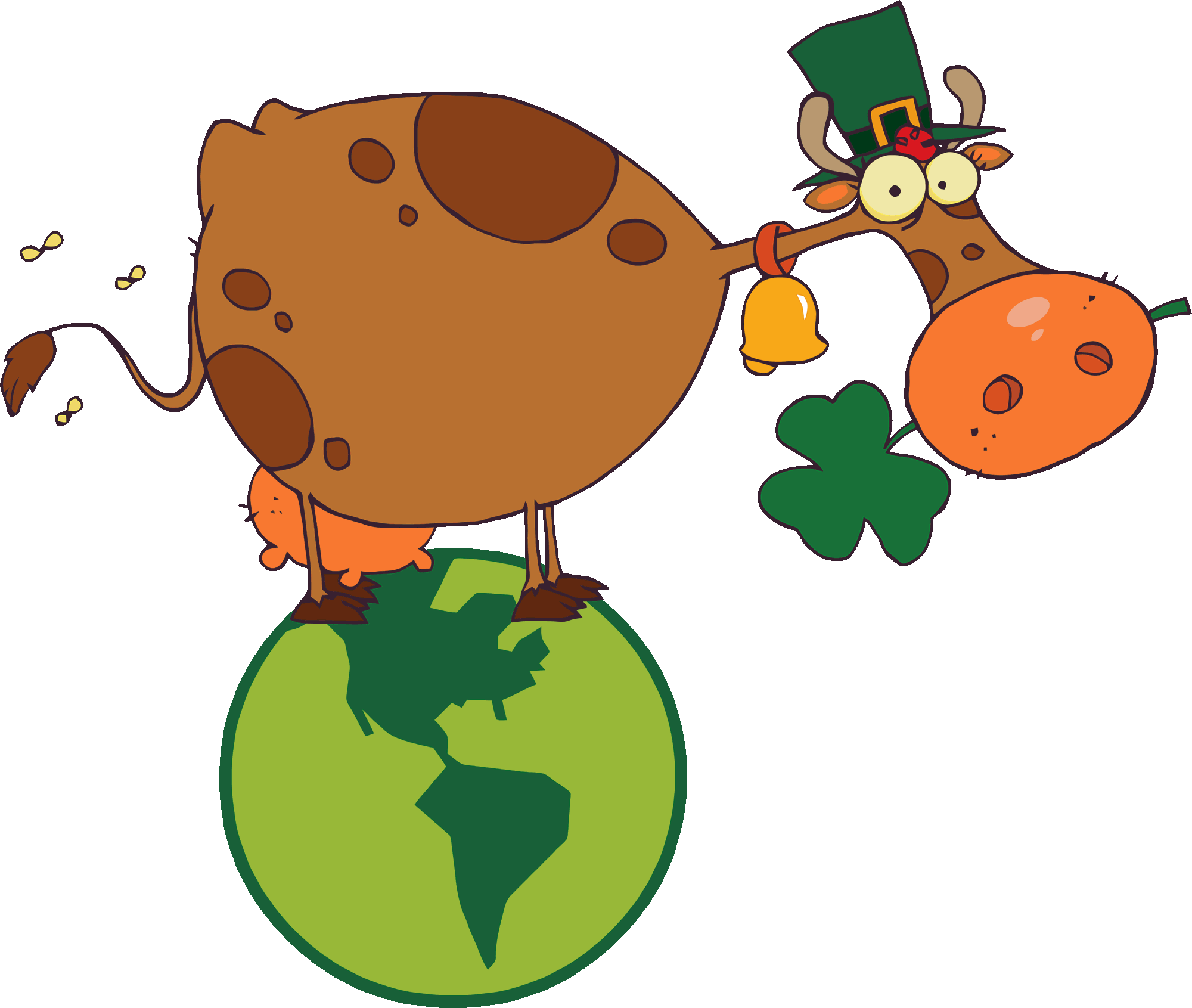 Free image/gif, Resolution: 2000x1691, File size: 83Kb, cartoon happy cow on globe at St Patrick’s Day, Clip Art picture with tags: st patricks, day, clip art, planet, green, cow