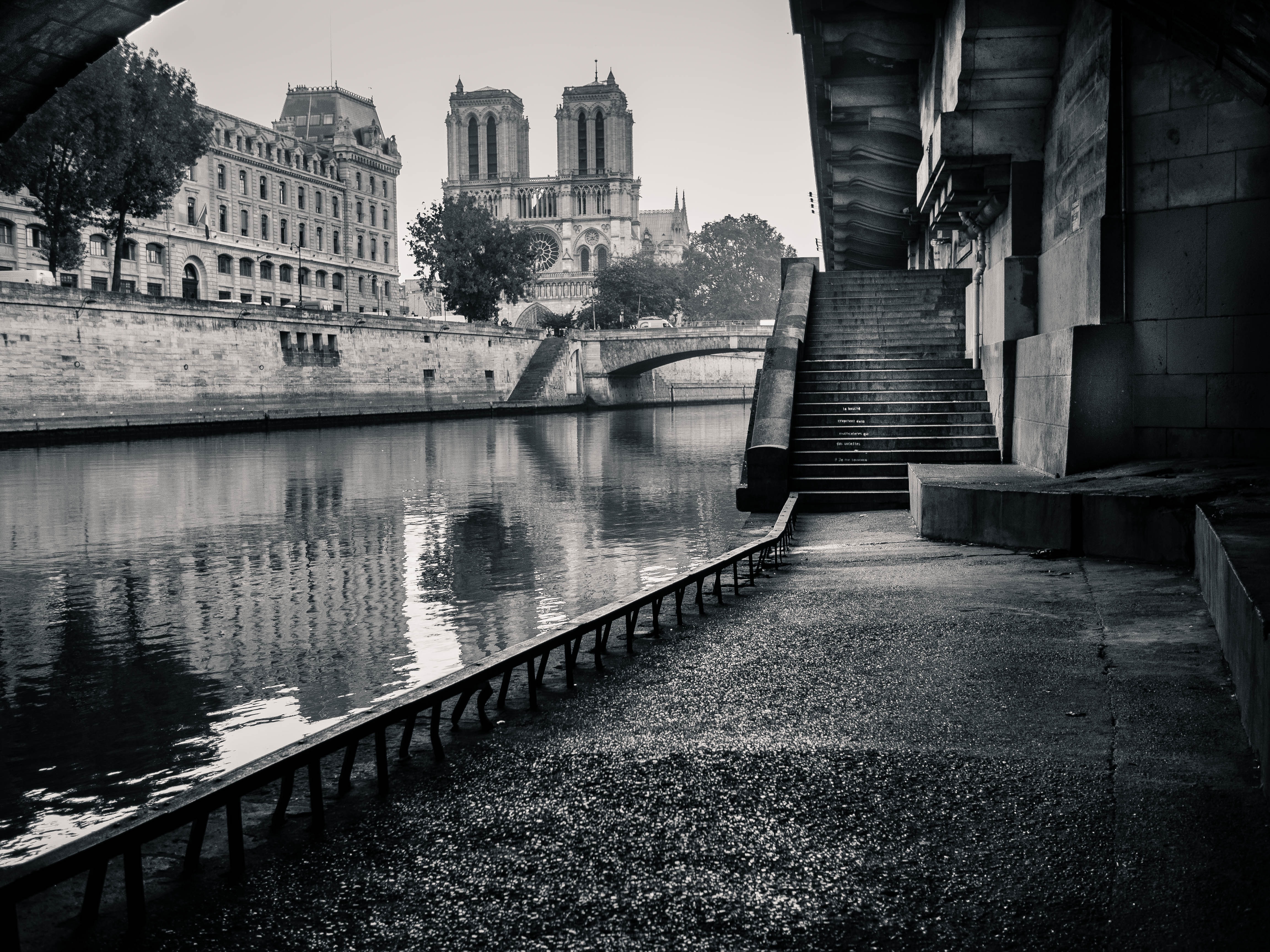 Free image/jpeg, Resolution: 4608x3456, File size: 3.41Mb, Front view of Notre Dame cathedral from sidewalk at water, france, paris picture with tags: canal, water, buildings, city, black and white