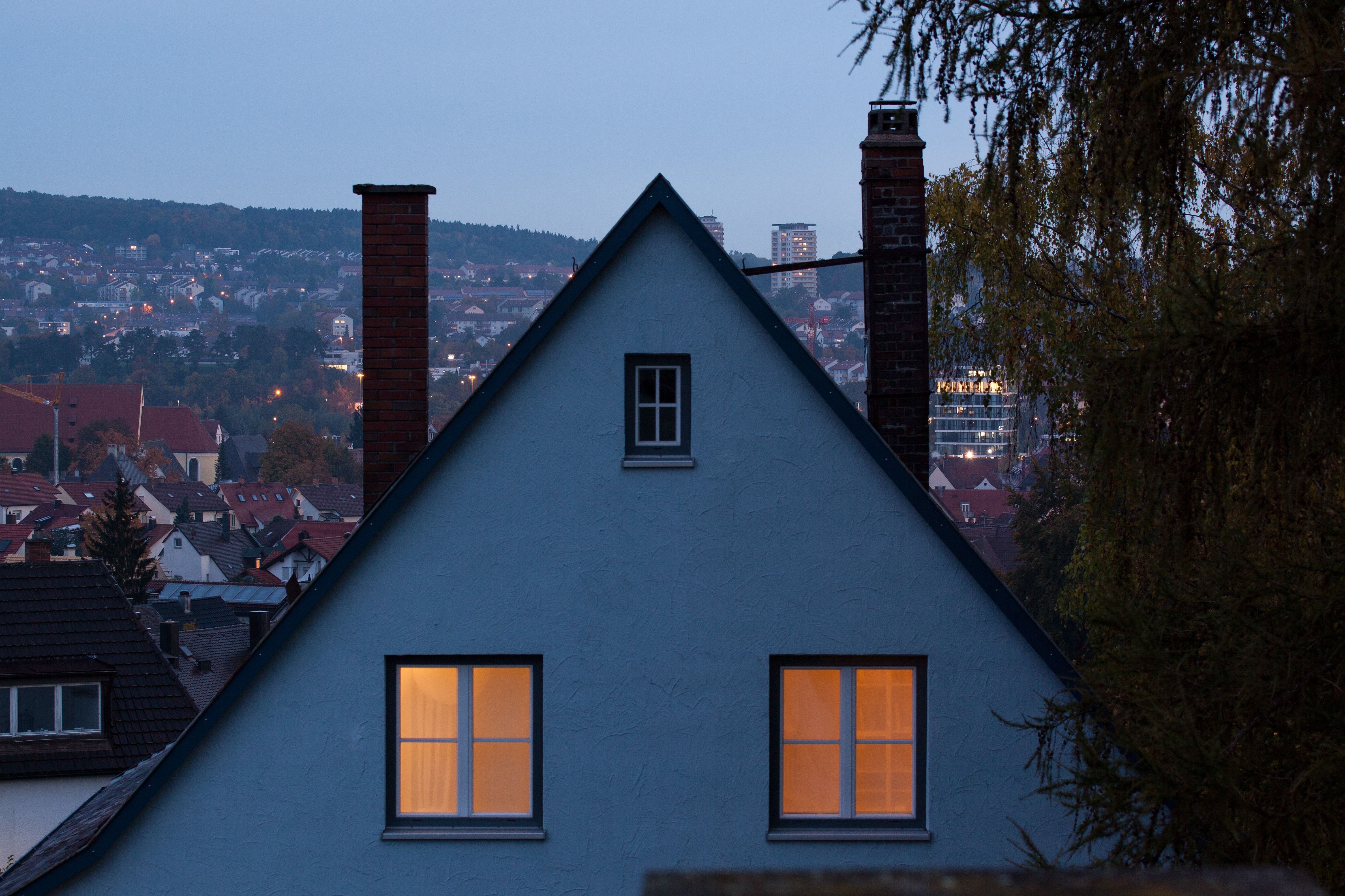 Free image/jpeg, Resolution: 4752x3168, File size: 4.23Mb, two illuminated windows on roof of house at dusk picture with tags: dawn, home, 2 window, apartment, enlightened, light